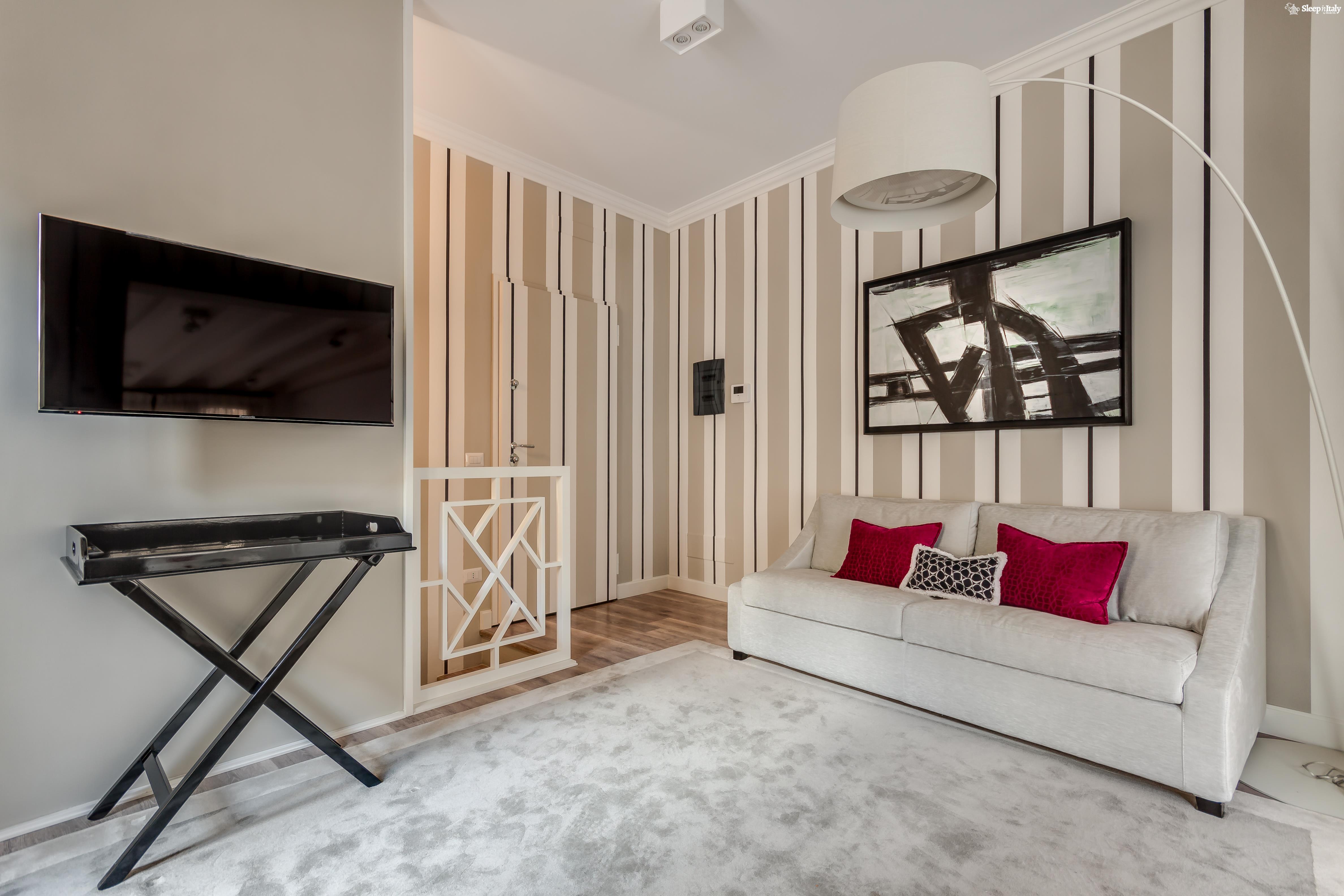 The main entrance leads to the living room with a comfortable sofa and TV .