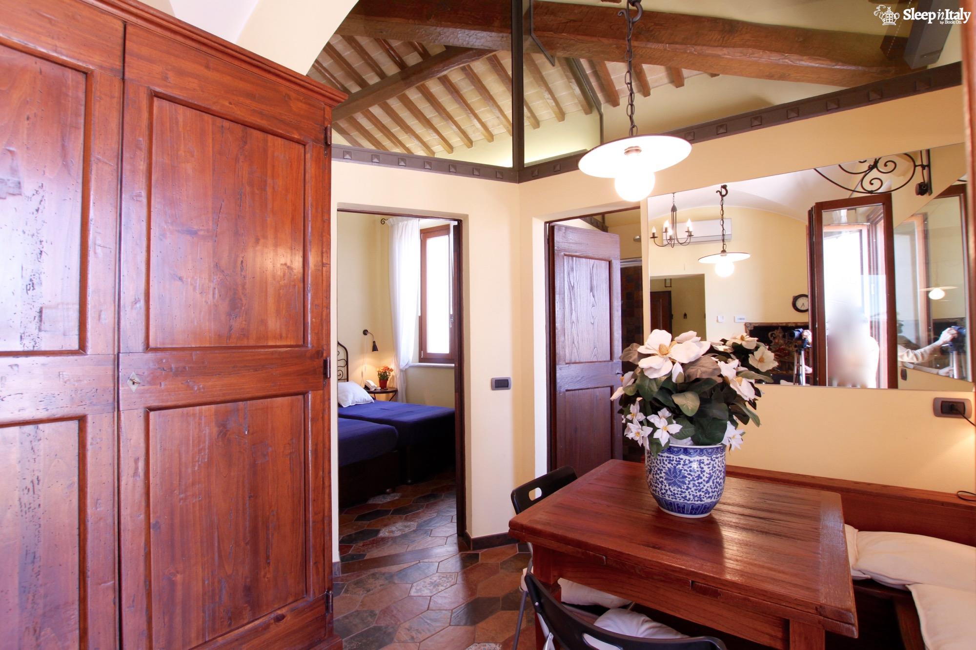 La casa è molto ben arredata con importanti travi in lego e bellissimi pavimenti fatti a mano in stile antico. Il balcone ha la vista sulla piazza mentre il terrazzo sovrastante di pertinenza e comune all'Int. 1, ha una magnifica vista sulla città antica, le colline circostanti e la campagna umbra.