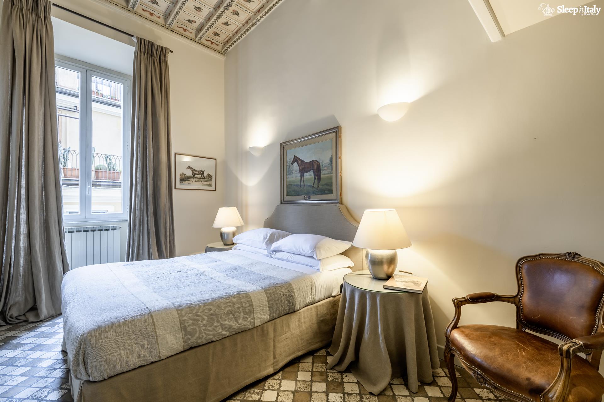 Questo appartamento racchiude l’essenza dell’eleganza romana: alti soffitti a cassettone, pavimenti antichi, arredi pregiati ed un’atmosfera calda ed accogliente, che renderà indimenticabile la vostra vacanza a Roma.