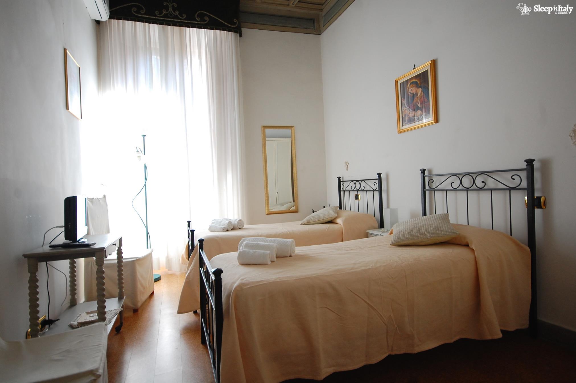 Camera da letto 2: 2 letti singoli, 1 comodino, 1 armadio, aria condizionata (pinguino), 1 finestra con affaccio interno, bagno in camera.