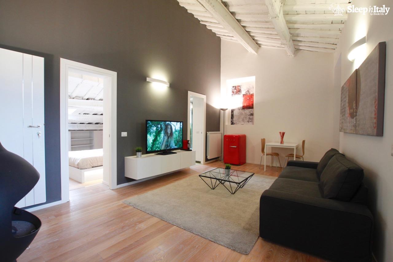 Ampia zona giorno con divano letto matrimoniale, televisore, frigobar, 1 finestra, 1 porta finestra verso il balcone, moderno camino di design, A \ C